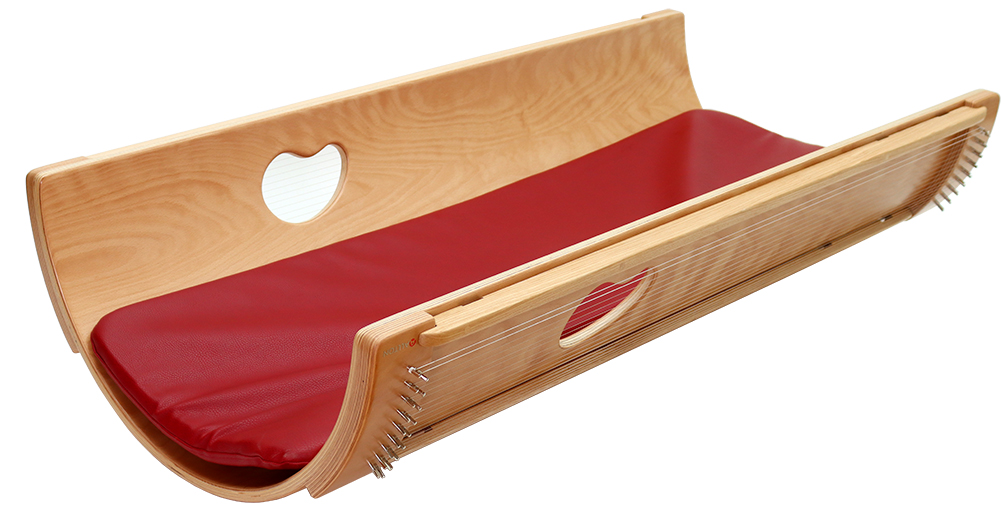 Zvuková rezonanční kolébka 130 cm, rozměry 76x34x130cm, bukové dřevo. Hmotnost 26 kg. Tvarované dřevo, pokryté 2 x 18 strunami, naladěno na A a E, každé se dvěma basovými strunami. , Zvuková masáž, zvuková lehátka, zvuková terapie, muzikoterapie.